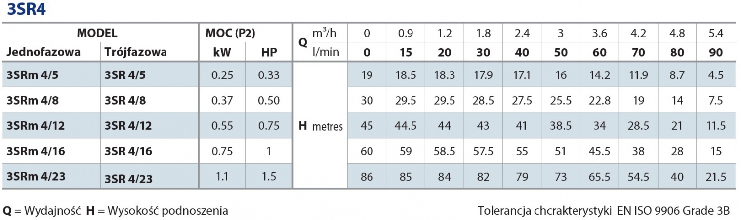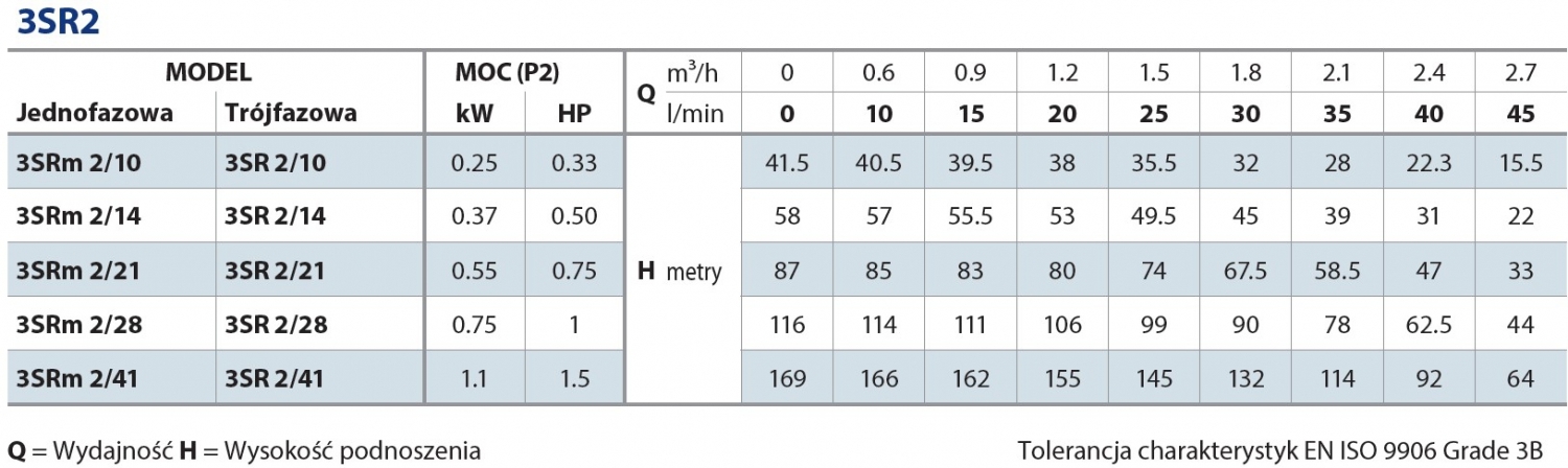 - Maksymalna wysokość podnoszenia typoszeregu: 250 m